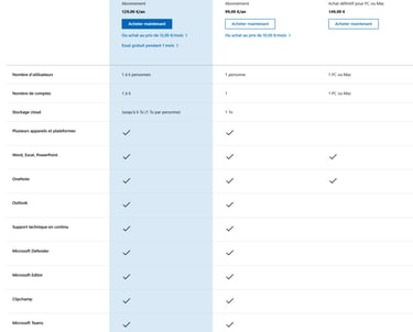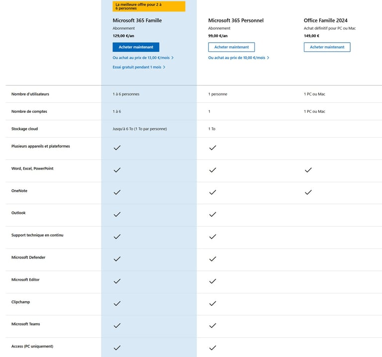 Les 3 offres Microsoft : https://www.microsoft.com/fr-fr/microsoft-365/buy/compare-all-microsoft-365-products